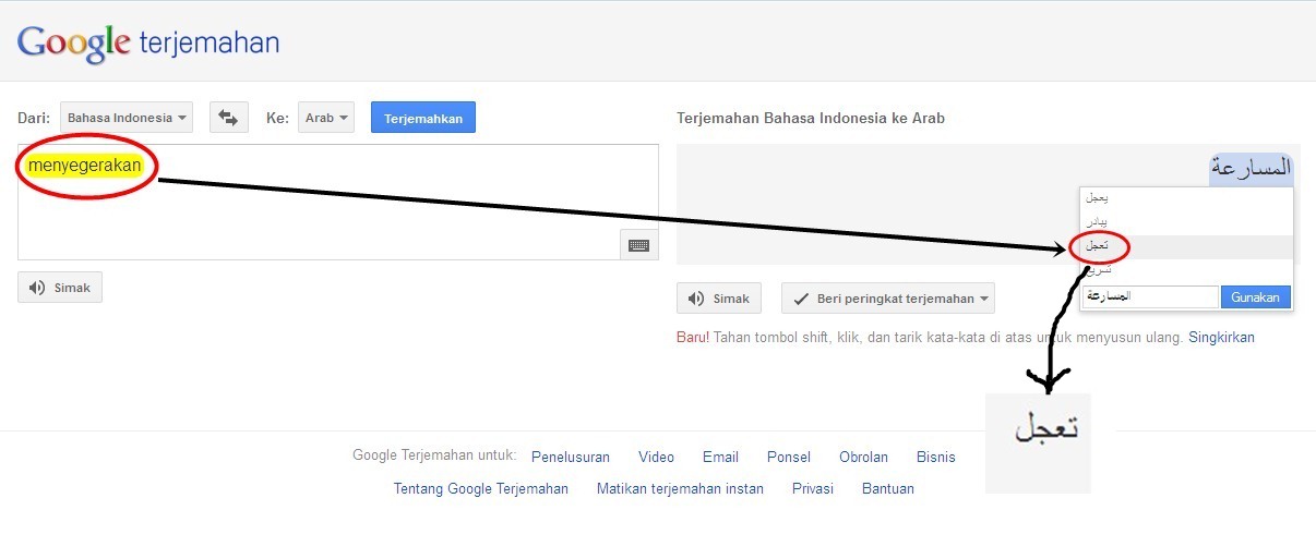 Percaya kan sekarang? Kalo masih ga percaya lo coba aja sendiri di Google Translate, ubah dulu option dari (Bahasa Indonesia) ke (Arab) terus ketik "menyegerakan" di kolom Bahasa Indonesia, translate deh dan hasilnya المسارعة klik hasilnya nanti dibawahnya bakal muncul beberapa alternatif, dan تعجل ada diantaranya. Lucu banget kan kalo kita ngomong kaya yg diatas padahal arti ta'jil itu sendiri menyegeraka.